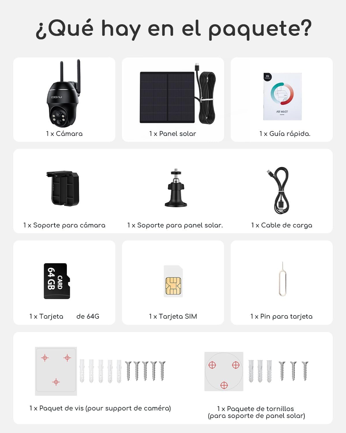 La cámara COOAU 4G LTE viene con una tarjeta microSD de 64GB y una tarjeta SIM que incluye 7 días de internet gratis.
